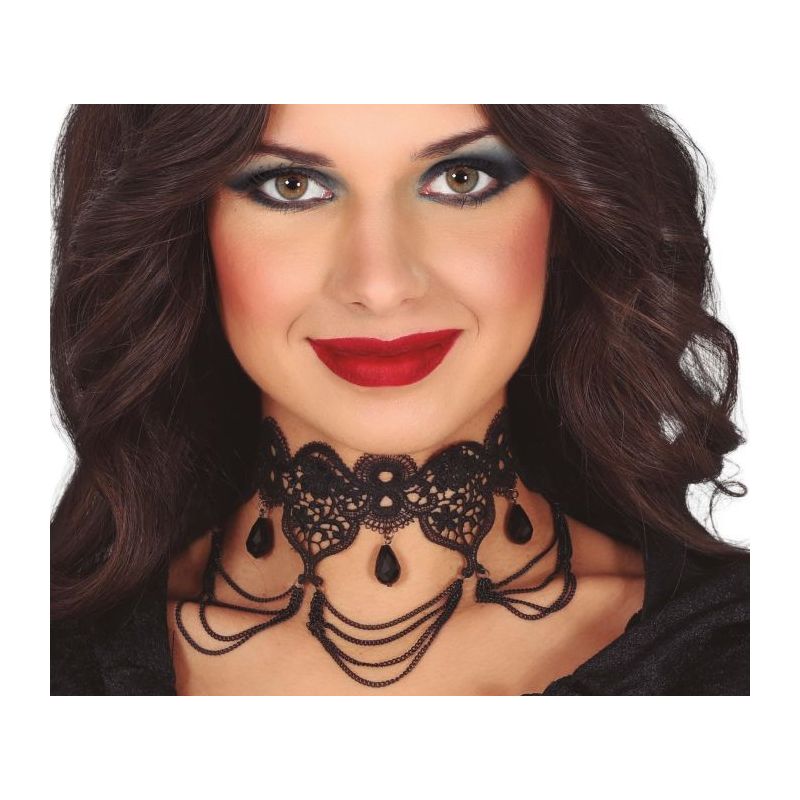 Celebra Halloween y cuida al máximo todos los detalles de tu disfraz añadiendo los accesorios perfectos para conseguir una caracterización de miedo. No te pierdas esta preciosa gargantilla negra bordada con piedritas negras y cadenas colgantes ideal para complementar tus disfraces de vampiresa o bruja en la noche más terrorífica y divertida del año.