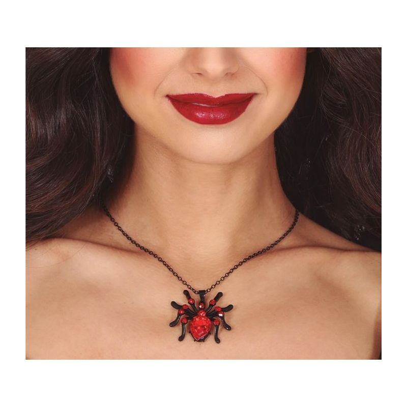 Collar con forma de araña adornada con rubís de color rojo ideal para complementar tus disfraces de vampiresa en fiestas de Halloween. Medida del colgante: 6 cm.