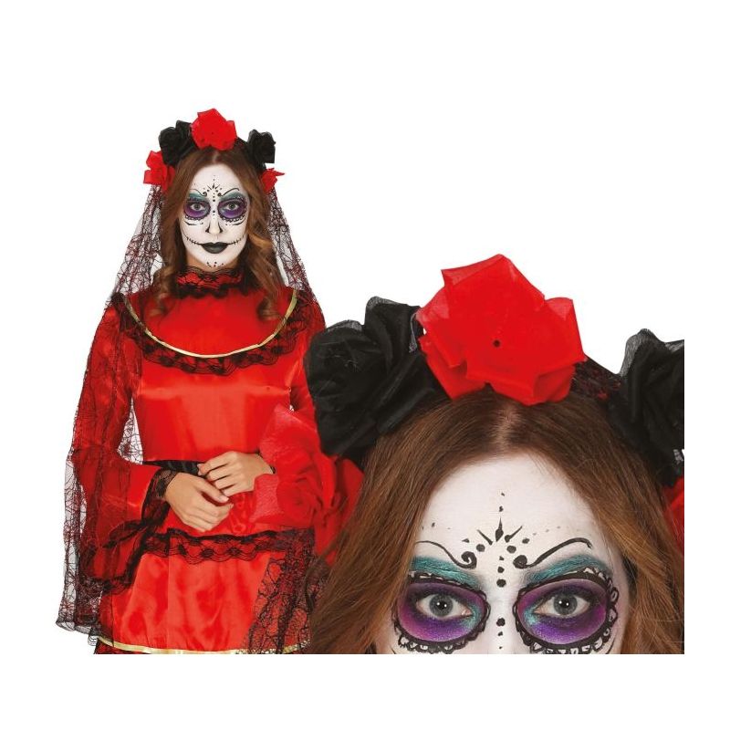 No te pierdas tu próxima fiesta de Halloween inspirada en el Día de los muertos y triunfa convertida en una auténtica Catrina. Hazte con el disfraz de muerte mejicana disponible en nuestra web y cuida al máximo todos los detalles sin olvidarte de esta original diadema de flores rojas y negras con velo. Otros accesorios de catrina disponibles a parte.