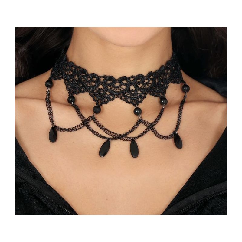 Celebra Halloween y cuida al máximo todos los detalles de tu disfraz añadiendo los accesorios perfectos para conseguir una caracterización de miedo. No te pierdas esta preciosa gargantilla negra bordada con piedritas negras y cadenas a juego ideal para complementar tus disfraces de vampiresa o bruja en la noche más terrorífica y divertida del año.