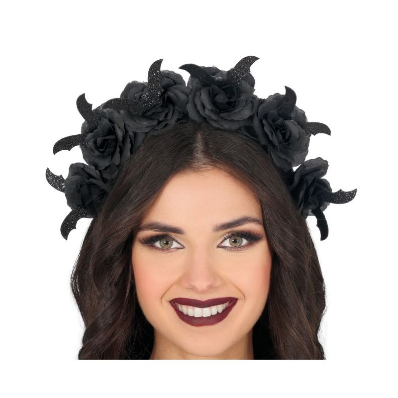 Diadema con flores negras ideal para complementar tus disfraces de catrina en fiestas de Halloween temáticas de muerte mejicana. Talla única para mujer. Otros modelos disponibles a parte.