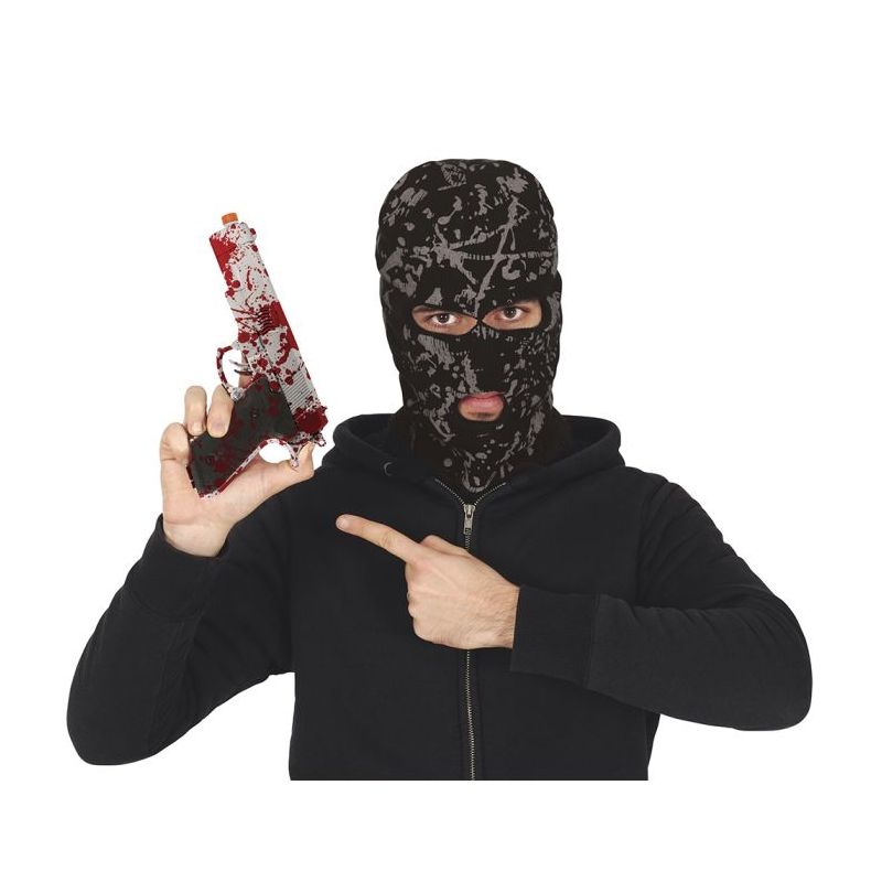 Pistola con sangre ideal para complementar tus disfraces de asesino en fiestas de Halloween o Carnaval. Medida: 24 cm. Otras armas disponibles a parte.