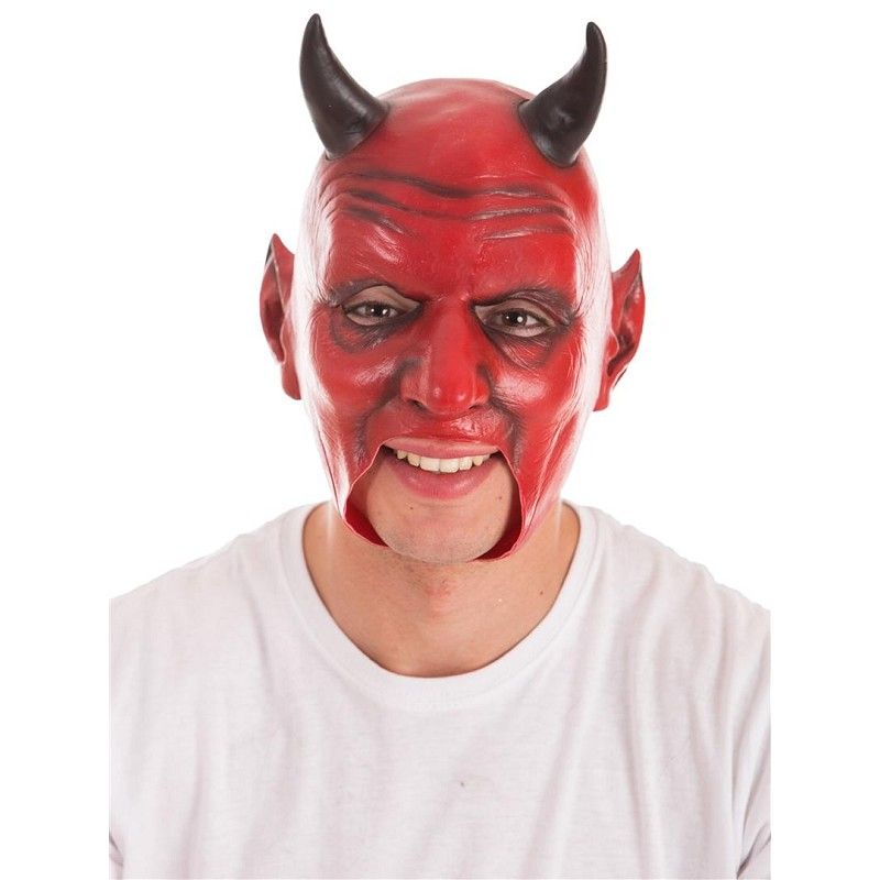 Máscara completa de látex rojo con cuernos ideal para complementar tus disfraces de Halloween y caracterizarte de diablo o demonio.