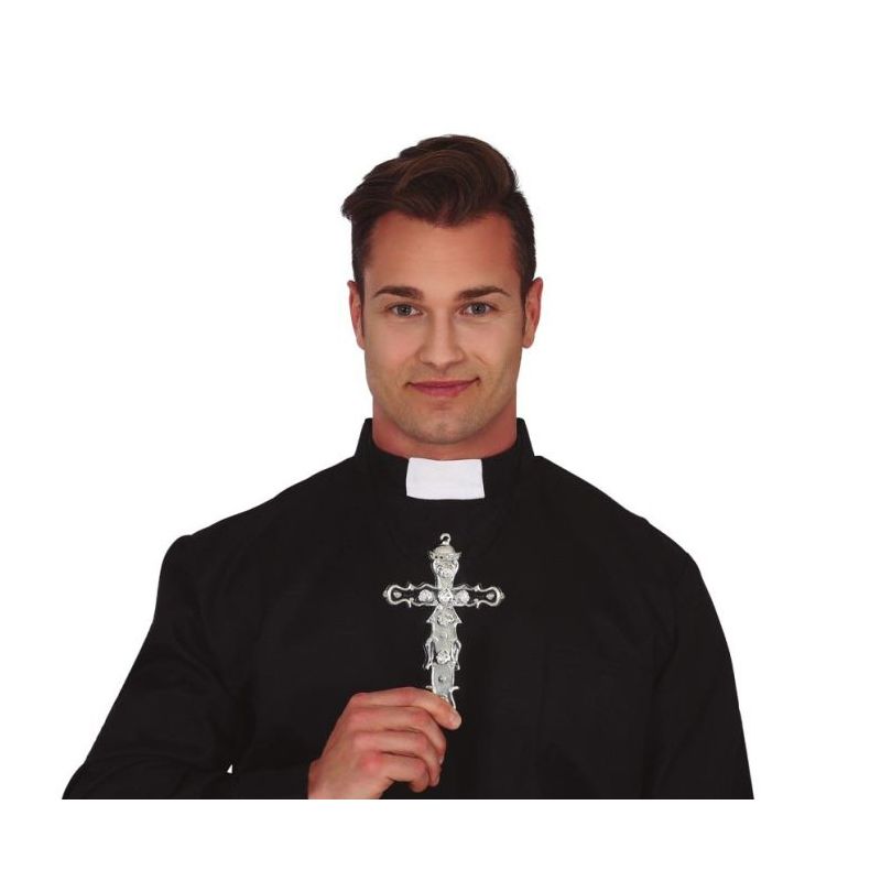 Cruz de color plata brillante con un elegante diseño ideal para complementar tus disfraces de cura, monja y otras temáticas en fiestas de Halloween o Carnaval.