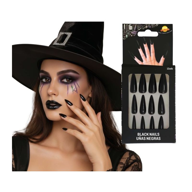 Pack de 12 uñas postizas de color negro con adhesivo ideales para complementar tus disfraces de bruja y otras temáticas en fiestas de Halloween. Otros colores disponibles a parte.