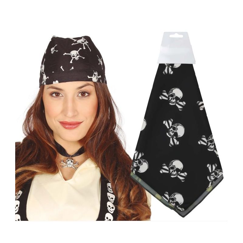 Pañuelo negro impreso con calaveras ideal para complementar tus disfraces de pirata en fiestas temáticas de Carnaval. Talla única para adulto hombre o mujer. Unisex.