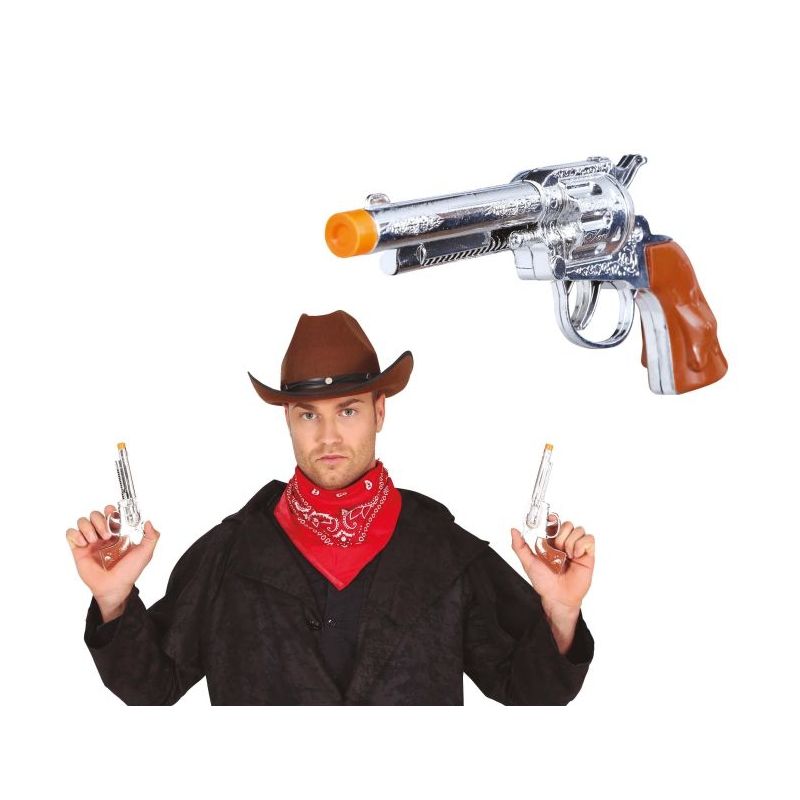 Pack de 2 pistolas perfectas para complementar disfraces de vaquero o cowboy en fiestas de Carnaval temáticas del Oeste. Medida: 20 cm. Cartucheras y otros accesorios de vaquero disponibles a parte.