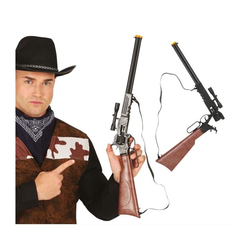 Rifle con mira perfecto para complementar disfraces de vaquero o cowboy en fiestas de Carnaval temáticas del Oeste. Medida: 64 cm. Disfraces y otros accesorios de vaquero disponibles a parte.