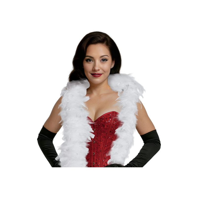 Boa de plumas de color blanco ideal para complementar tus disfraces de chica charlestón en fiestas de Carnaval temáticas de los años 20. Espesor: 80 gramos. Otros colores y gramajes disponibles a parte.