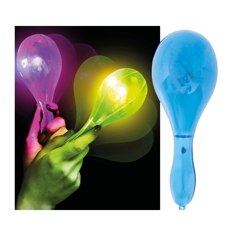 Maraca con luz disponible en los siguientes colores: azul, rosa, rojo, morado o amarillo. Precio por unidad.