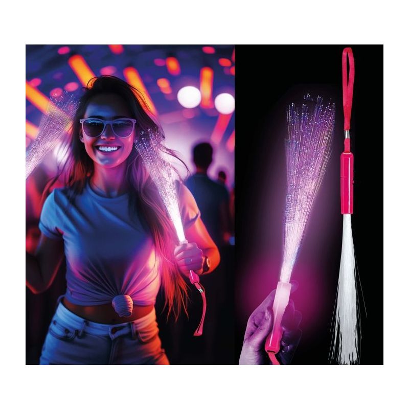 Bastón con flecos de fibra óptica luminosos disponible en colores surtidos. Medida: 25 cm.