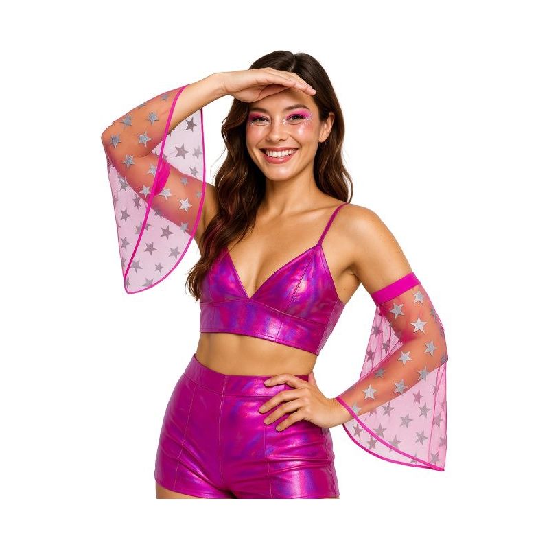 Par de mangas de tul acampanadas en color rosa decoradas con estrellas plateadas ideales para crear looks disco en fiestas de Carnaval temáticas de los años 60, 70 y 80. Otros colores disponibles a parte.