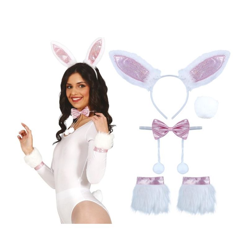 Set de accesorios para disfrazarte de conejita en fiestas de Carnaval o despedidas de soltera. Incluye: cola, diadema con orejas, pajarita y muñequeras.