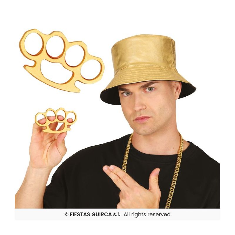 Puño americano de color dorado ideal para complementar tus disfraces de rapero y otras temáticas en fiestas de Carnaval.