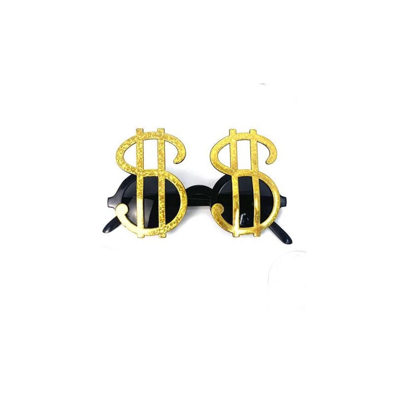 Gafas con el símbolo del dólar en color dorado ideales para complementar tus disfraces de jeque, rapero y otras temáticas. Talla única adulto.