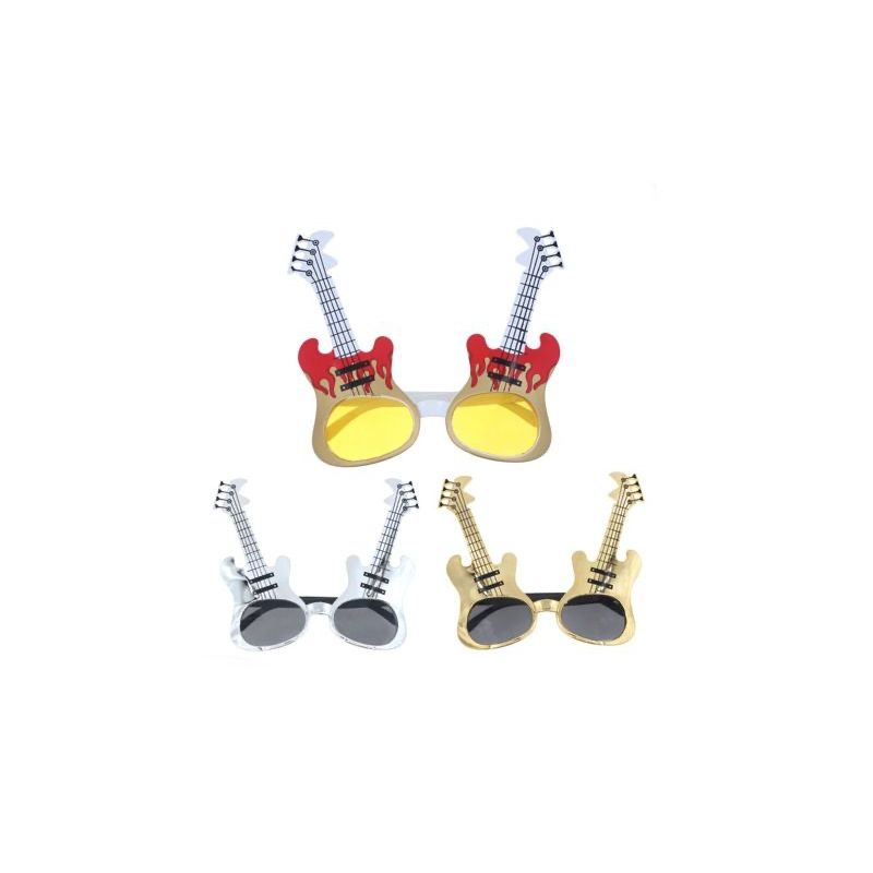 Gafas con forma de guitarra eléctrica ideales para complementar tus disfraces de rockero o cantante. Talla única adulto. 3 colores disponibles (precio por unidad). Específica el color que deseas en el apartado “comentarios del pedido”.