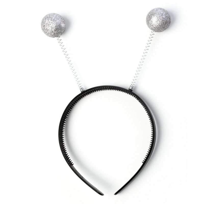 Diadema con antenas de purpurina en color plata. Talla única para adulto hombre o mujer (unisex). Otros colores disponibles a parte.