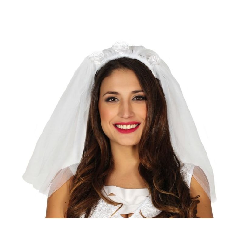 Diadema con velo de tul en color blanco ideal para complementar tus disfraces de novia en fiestas de Carnaval y otras celebraciones como despedidas de soltera. Talla única de adulto para mujer.