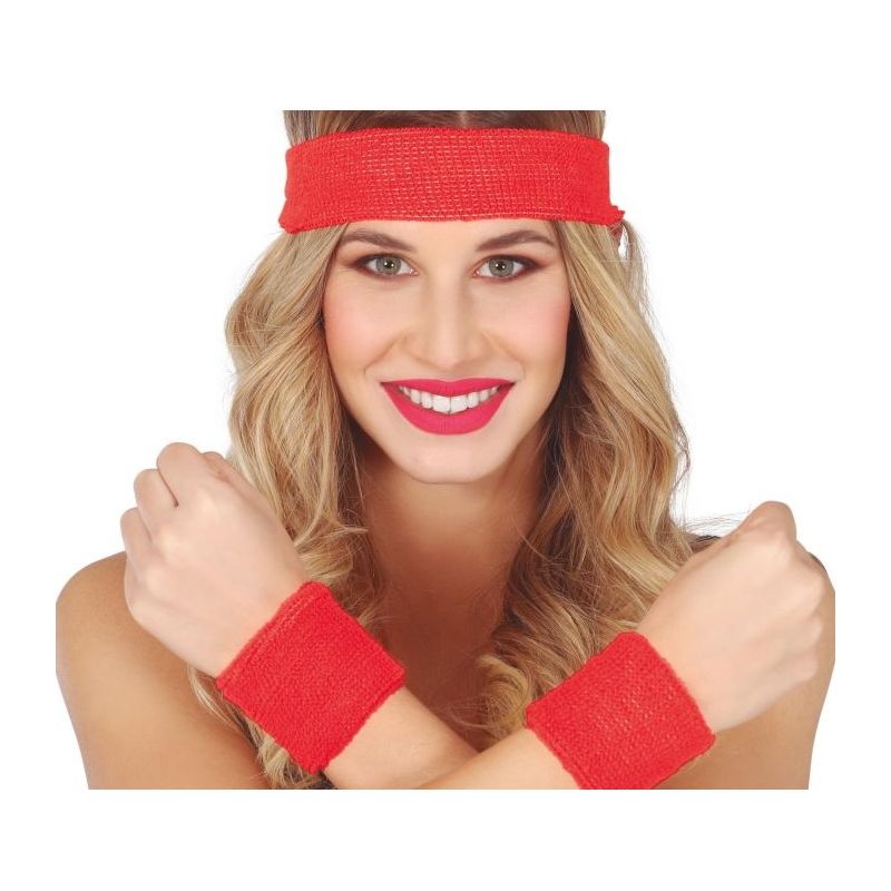 No te pierdas tu próxima fiesta de Carnaval temática de los años 80 y crea un look original y divertido con estas muñequeras elásticas rojas que además llevan la cinta a juego para la cabeza. Completa tu disfraz con otros accesorios ochenteros como los calentadores disponibles a parte.