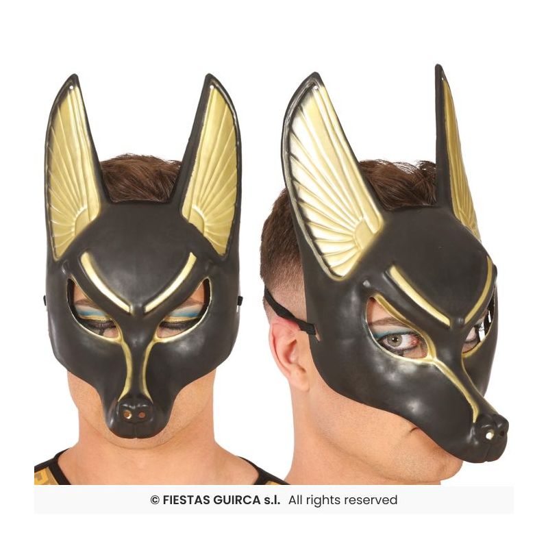 Máscara con hocico de perro y grandes orejas ideal para complementar tus disfraces del Dios egipcio Anubis. Talla única de adulto para hombre.