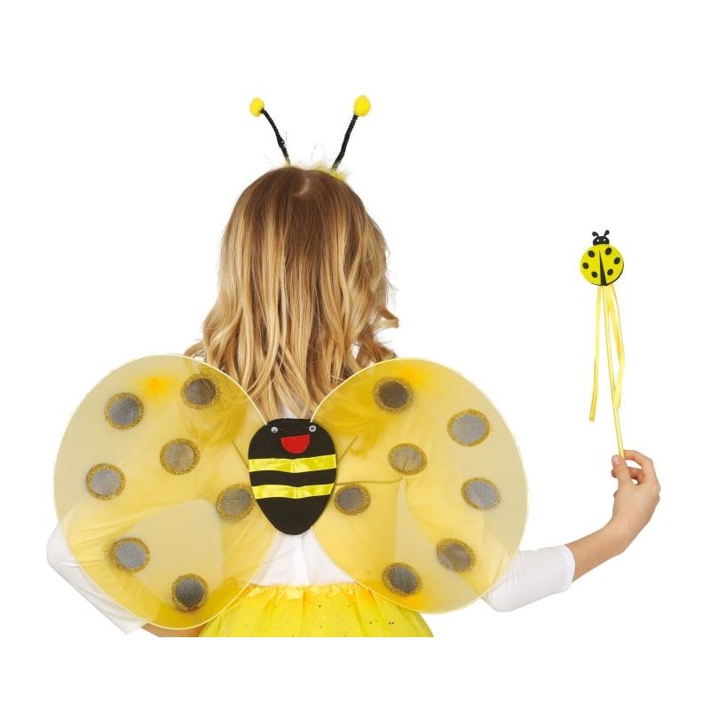 Set de abeja infantil compuesto por alas de color amarillo, diadema con antenas y varita. Talla única para niña. Medida de las alas 54x34 cm.