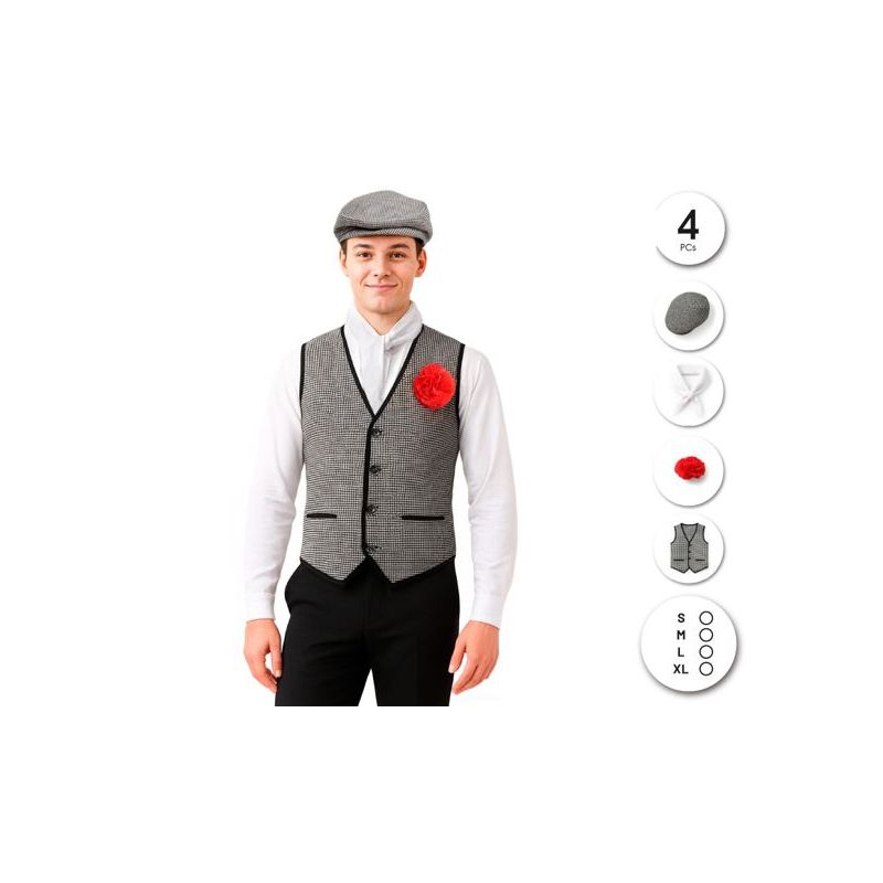 Set de accesorios de chulapo compuesto por chaleco de cuadros, gorra a juego, pañuelo blanco para el cuello y clavel rojo. Disponible en tallas S, M, L y XL de adulto para hombre.