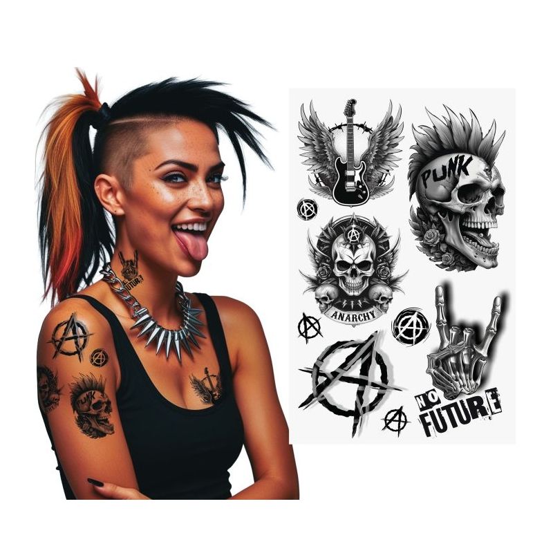 Tatuajes temporales con diseño de dibujos de inspiración punk ochenteros en blanco y negro. Medida de la hoja: 14 x 30 cm. Otros diseños disponibles a parte.