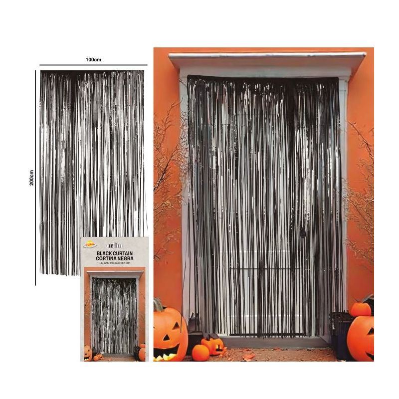 Cortina de tiras de plástico metalizadas en color negro ideal para crear fondos y decorar fiestas de cumpleaños, cotillones de fin de año, Halloween y otras celebraciones. Medida: 1 x 2 m. Otros colores disponibles a parte.