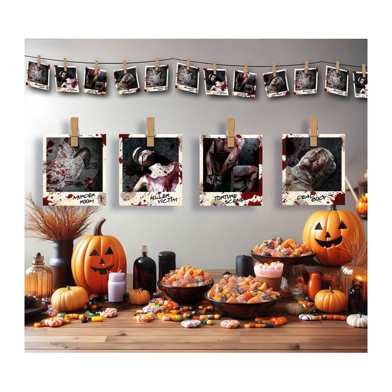En nuestra web encontrarás una gran variedad de opciones terroríficas perfectas para decorar tus fiestas de Halloween y sorprender a todos tus invitados. No te pierdas esta original guirnalda con fotos y escenas sangrientas de crímenes con la que conseguirás un resultado de miedo al ponerla en cualquier rincón.