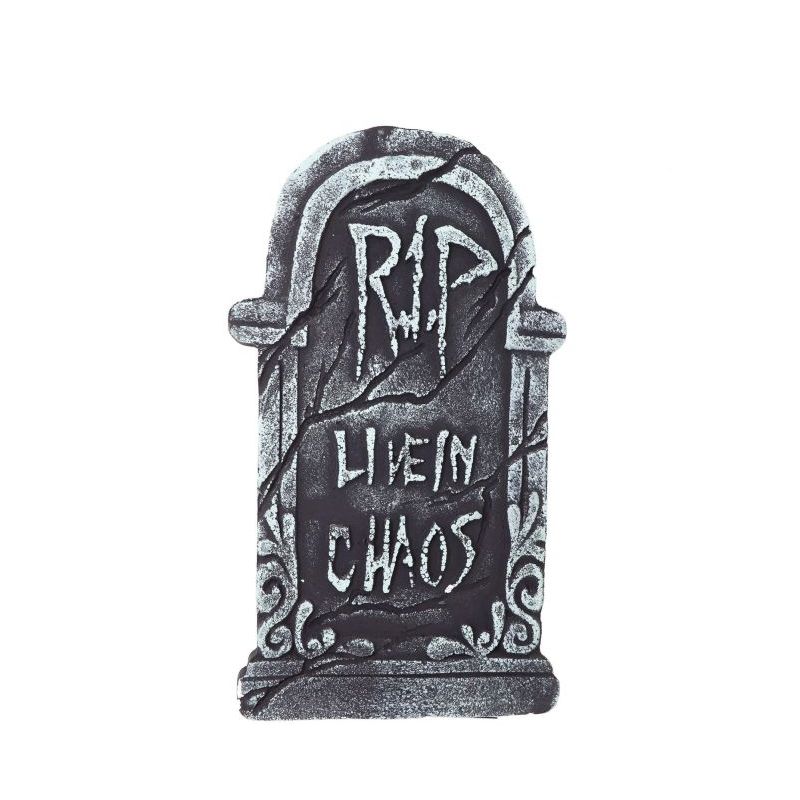 Lapida con mensaje “Live in Chaos” ideal para montar cementerios y decorar fiestas de Halloween. Medida: 43 x 22 cm. Otros modelos disponibles a parte.