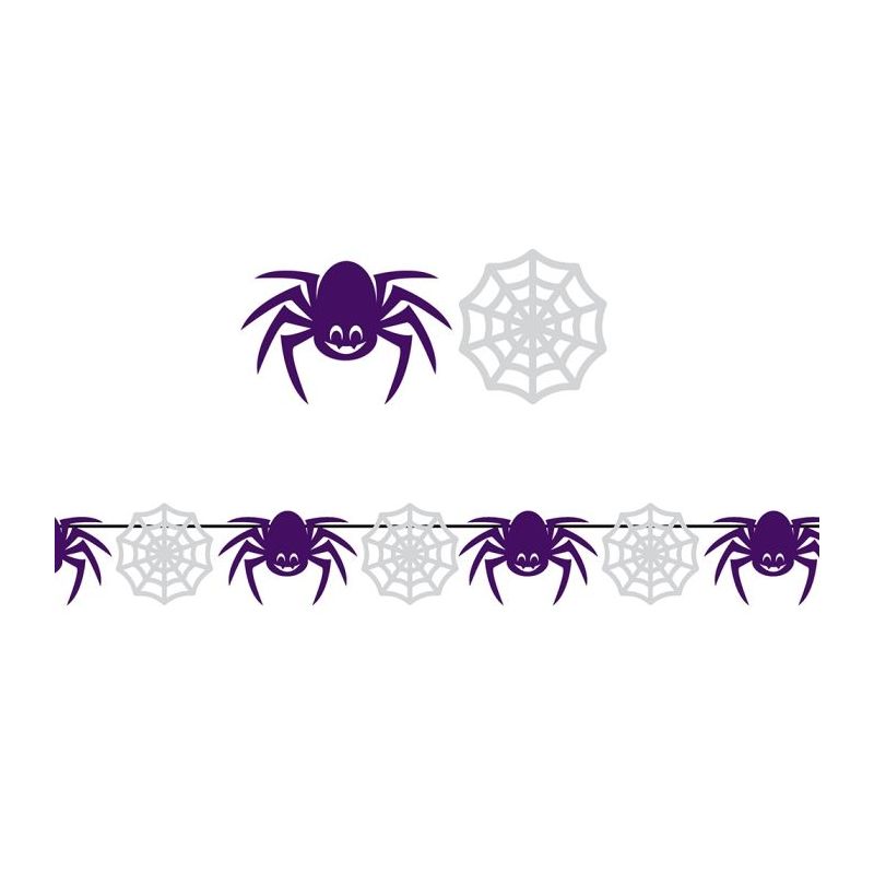 Guirnalda formada por arañas y telarañas ideal para decorar tus fiestas de Halloween. Medida: 3 metros de largo. Medida de las arañas y telarañas: 20 x 18 cm.