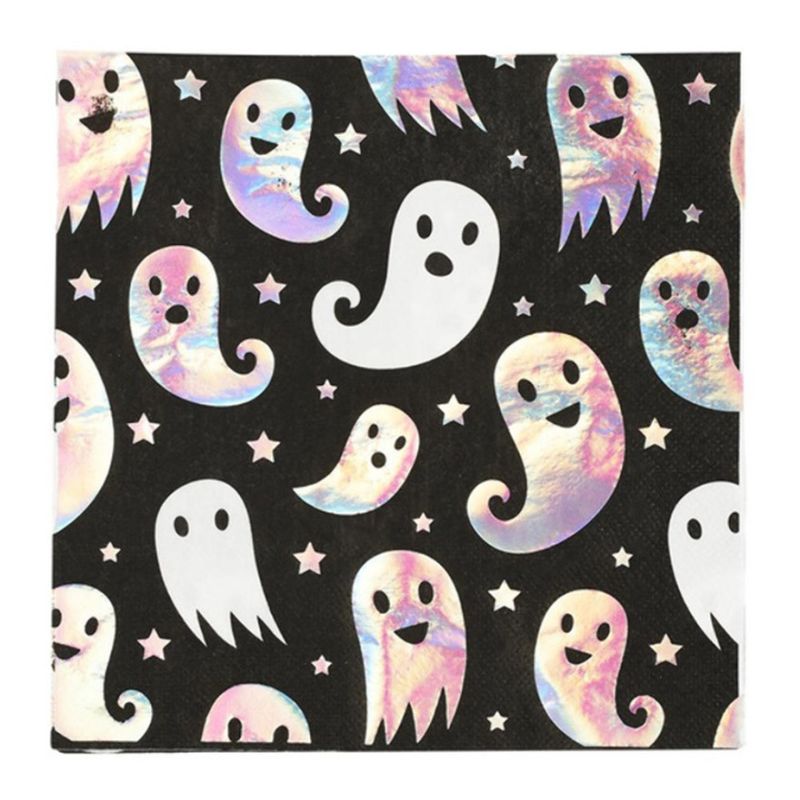 Pack de 10 servilletas de papel negras impresas con fantasmas iridiscentes ideales para montar mesas en fiestas de Halloween. Resto de la vajilla a juego disponible a parte.