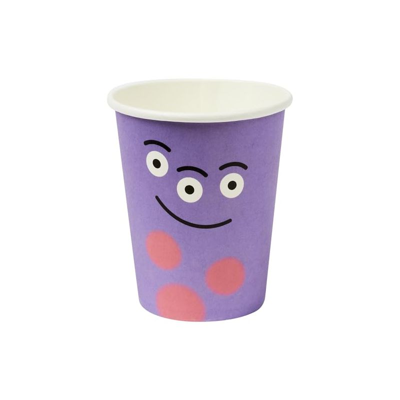 Pack de 8 vasos de papel morados impresos con caritas de monstruos ideales para montar mesas en fiestas de Halloween. Resto de la vajilla a juego disponible a parte.
