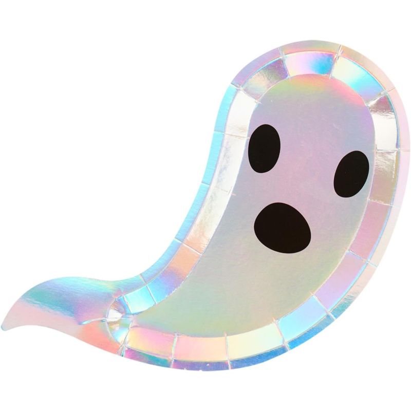 Pack de 8 originales platos de cartón con forma de fantasma holográfico ideales para servir los aperitivos y postres en tus fiestas de Halloween.