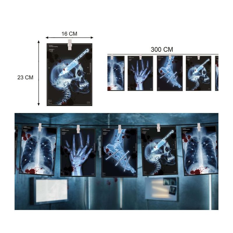 Guirnalda con radiografías de cadáveres ideal para decorar tus fiestas de Halloween. Largo: 3 metros. Medida de las radiografías: 16 x 22 cm. Otros modelos disponibles a parte.