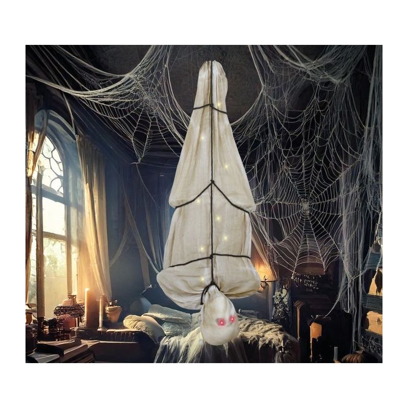 Decoración de Halloween con forma de hombre colgado animado con sistema de luz, sonido y movimiento. Medida: 170 cm.