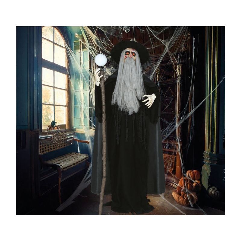 Mago con bastón animado con sistema de luz sonido y movimiento ideal para decorar tus fiestas de Halloween. Medida: 190 cm.