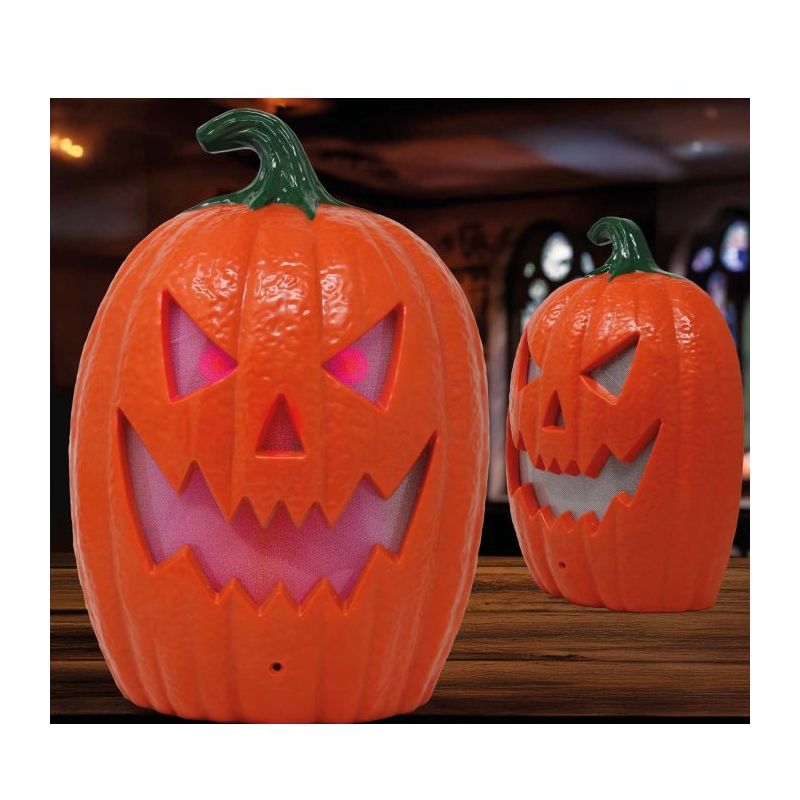 Silueta de calabaza de plástico naranja con sistema de luz y sonido ideal para decorar tus fiestas de Halloween. Funciona con pilas (no incluidas).