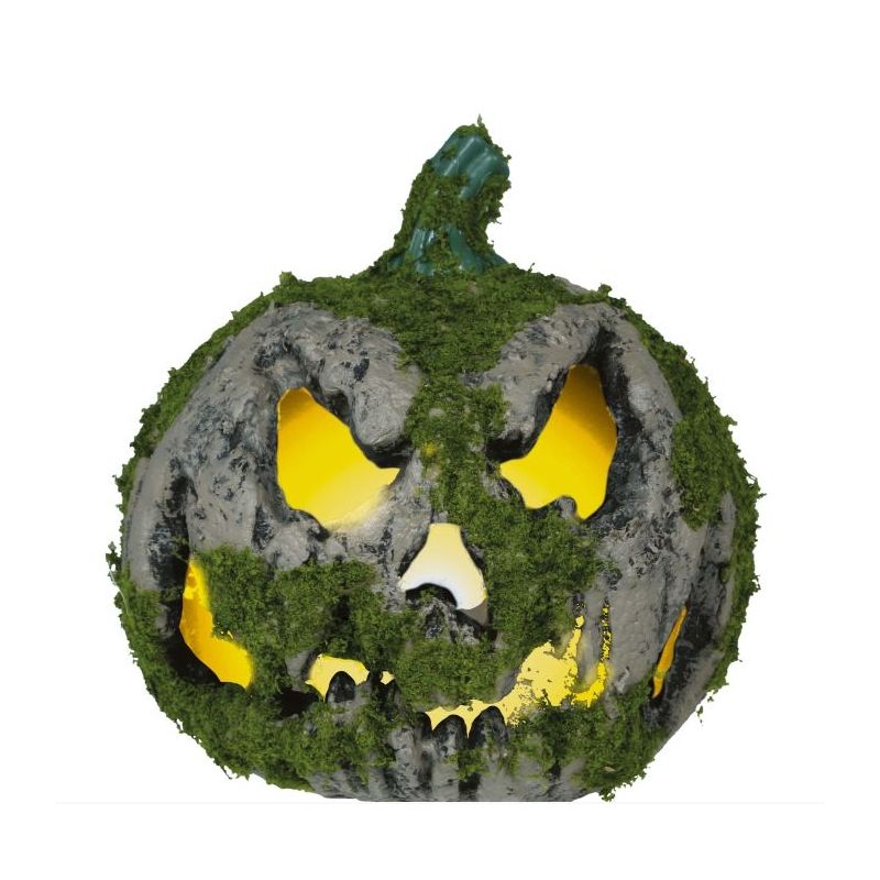 Calabaza con musco ideal para decorar tus fiestas de Halloween. Incluye sistema de luz en su interior. Medida: 20 cm.