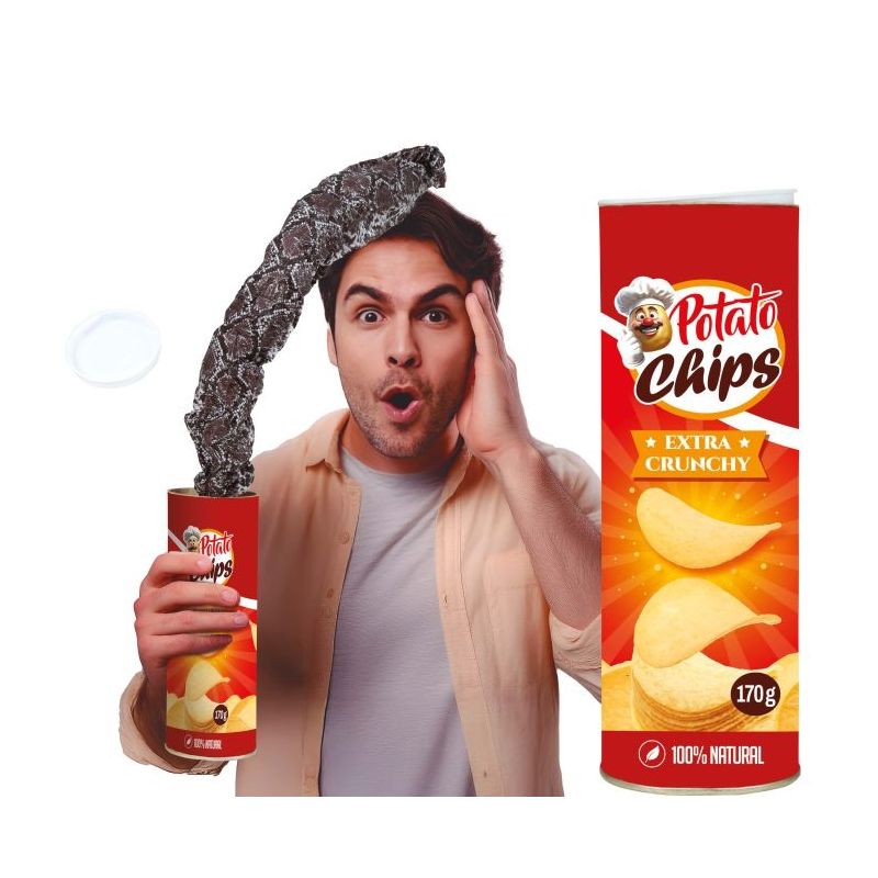 Original bote de patatas inspirado en uno de Pringles que al quitar la tapa deja salir disparado un divertido gusano saltarín gigante. Medida: 20 cm.