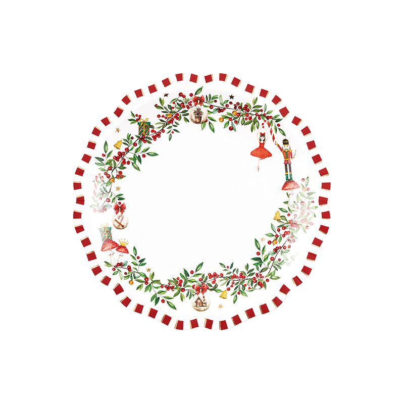 Pack de 8 platos redondos de cartón con diseño vintage ideales para montar mesas en fiestas de Navidad y fin de año. Medida: 27 cm. Resto de la vajilla a juego disponible a parte. Diseño exclusivo Givi Italia.