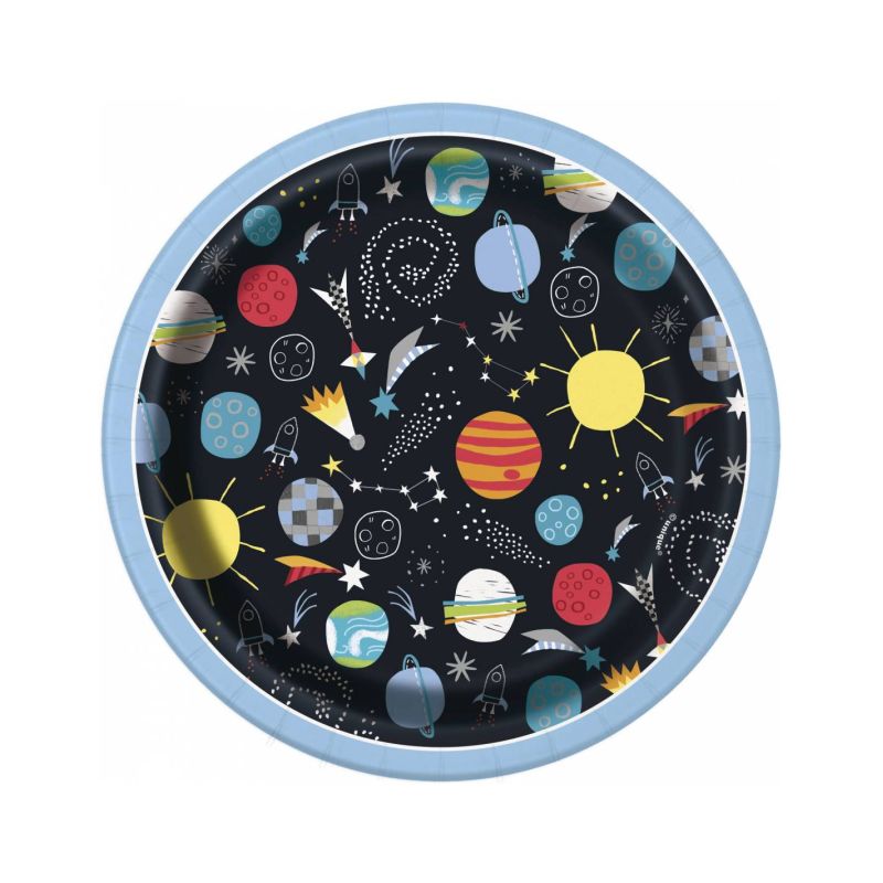 Pack de 8 platos redondos de cartón impresos con diseño espacial de planetas ideales para servir los postres y montar mesas en fiestas de cumpleaños infantiles. Resto de la vajilla a juego disponible a parte.