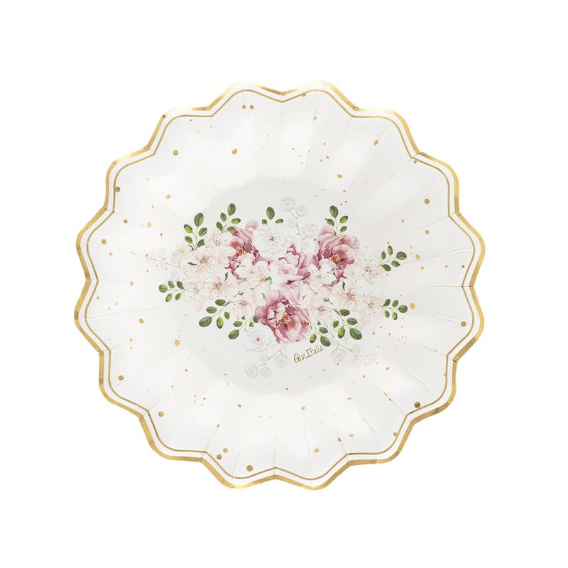 Pack de 6 platos hondos de cartón con elegante diseño de rosas ideales para montar mesas en fiestas de Navidad y fin de año. Medida: 24 cm. Resto de la vajilla a juego disponible a parte. Diseño exclusivo Givi Italia.