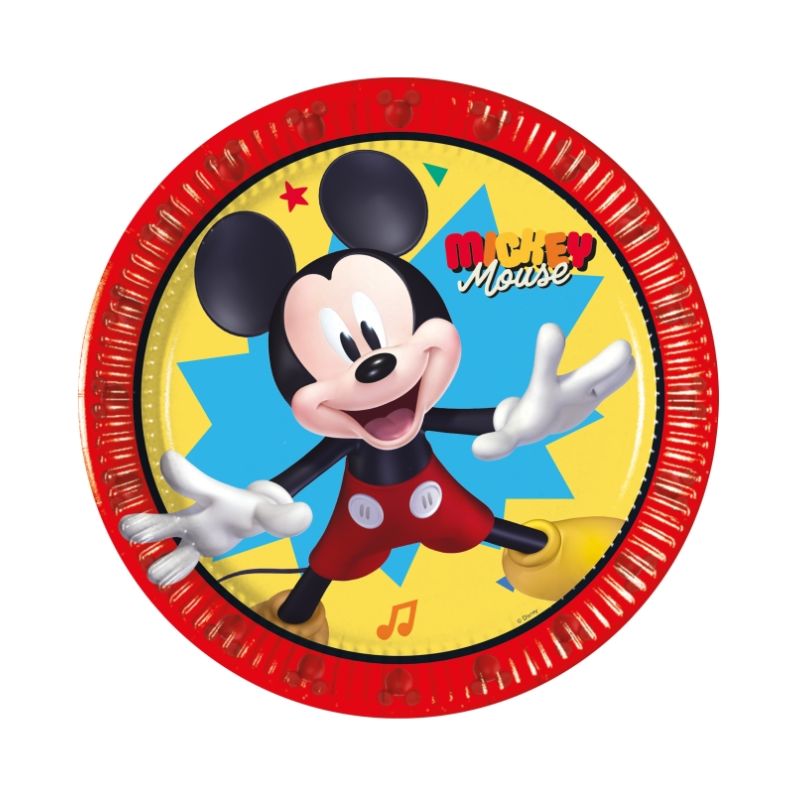 Pack de 8 platos desechables de cartón redondos ideales para montar mesas en fiestas de cumpleaños infantiles temáticas del ratoncito Mickey Mouse. Medida:20 cm. Licencia oficial Disney.