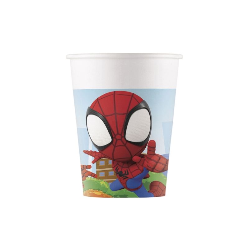 Pack de 8 vasos desechables de cartón ideales para montar mesas en fiestas de cumpleaños infantiles temáticas del superhéroe Spidey. Capacidad: 200ml. Licencia oficial.