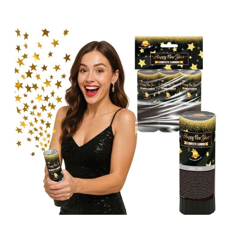 Pack de 3 mini cañones de confetti dorado metalizado en forma de estrellitas ideal para animar fiestas de cumpleaños y otras celebraciones especiales como cotillones de fin de año.