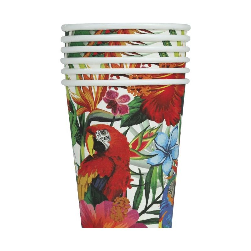 Pack de 6 vasos de papel impresos con un original diseño hawaiano multicolor. Capacidad: 240 ml. Medida: 9 cm.