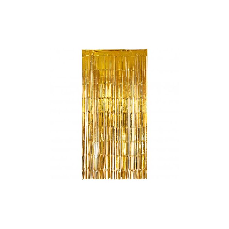 Cortina metalizada de flecos en color dorado ideal para usar como fondo y decorar fiestas de cumpleaños y otras celebraciones especiales. Medida: 2 x 1 m. Otros colores disponibles a parte.