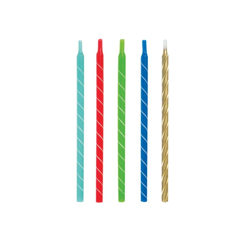 Pack de 12 velas largas multicolor con diseño espiral brillante ideales para decorar tus tartas de cumpleaños. Medida: 13 cm. Otros modelos disponibles a parte.