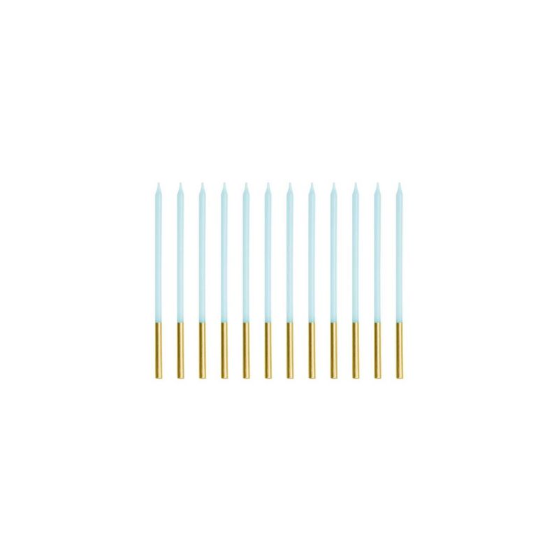 Pack de 12 velas bicolor en tonos azul pastel y dorado ideales para decorar tus tartas en fiestas de cumpleaños, aniversarios y otras celebraciones especiales. Medida: 14 cm. Otros modelos de velas disponibles a parte.